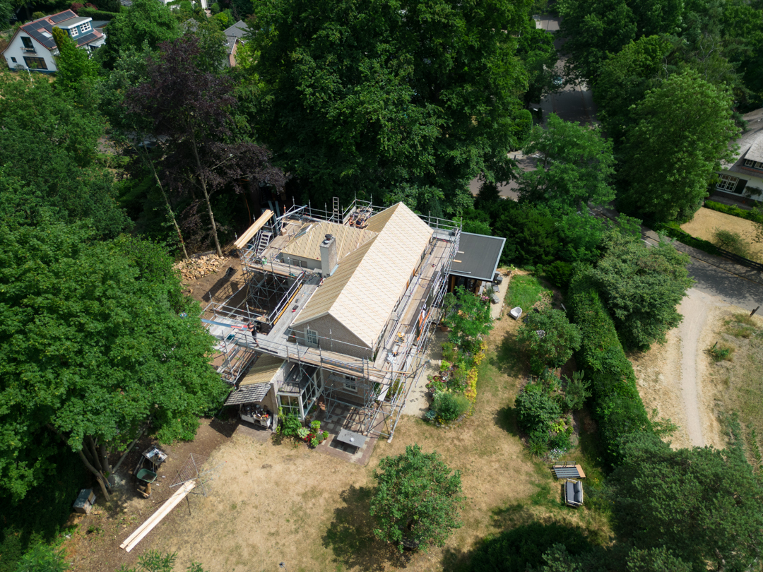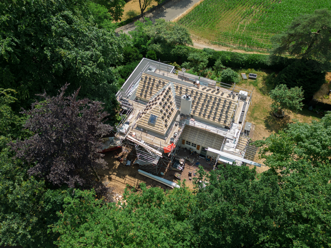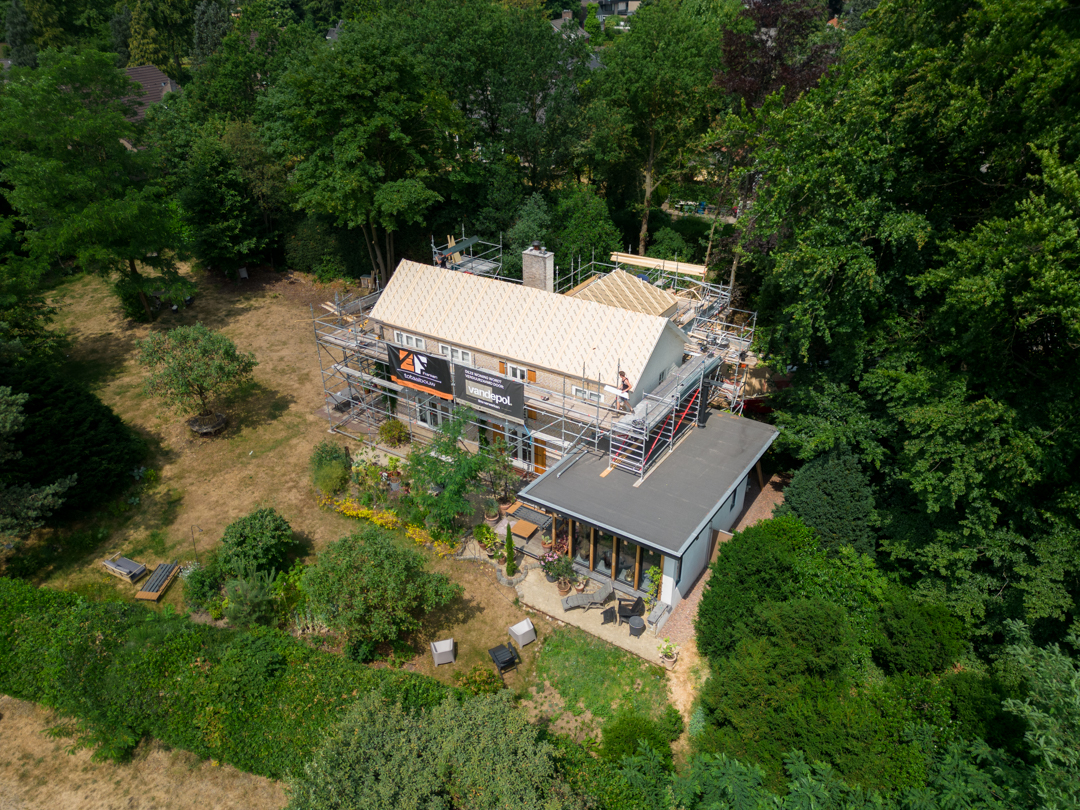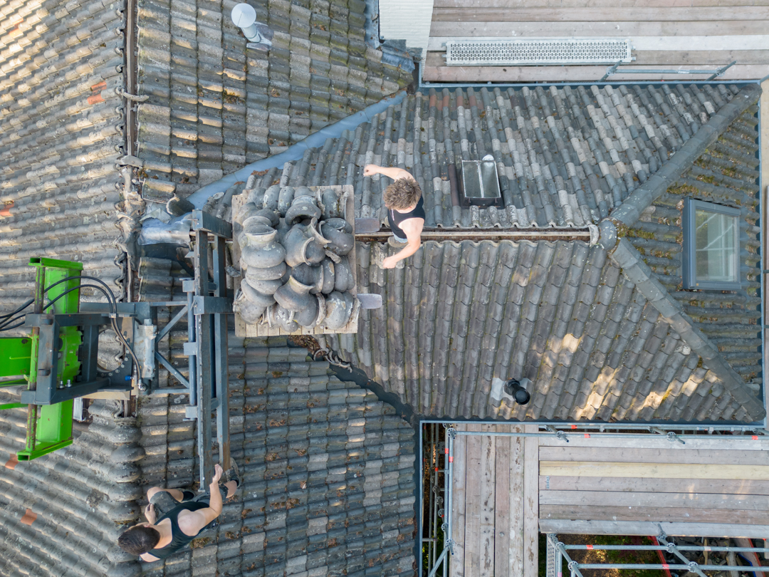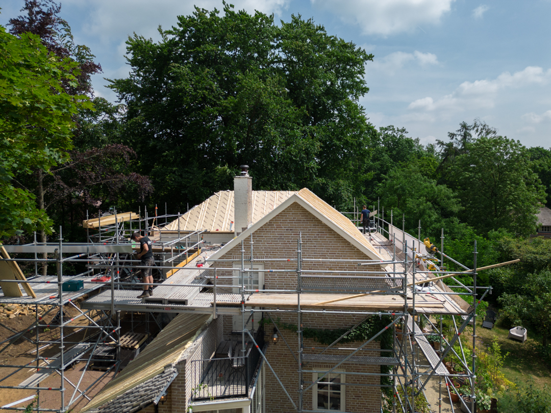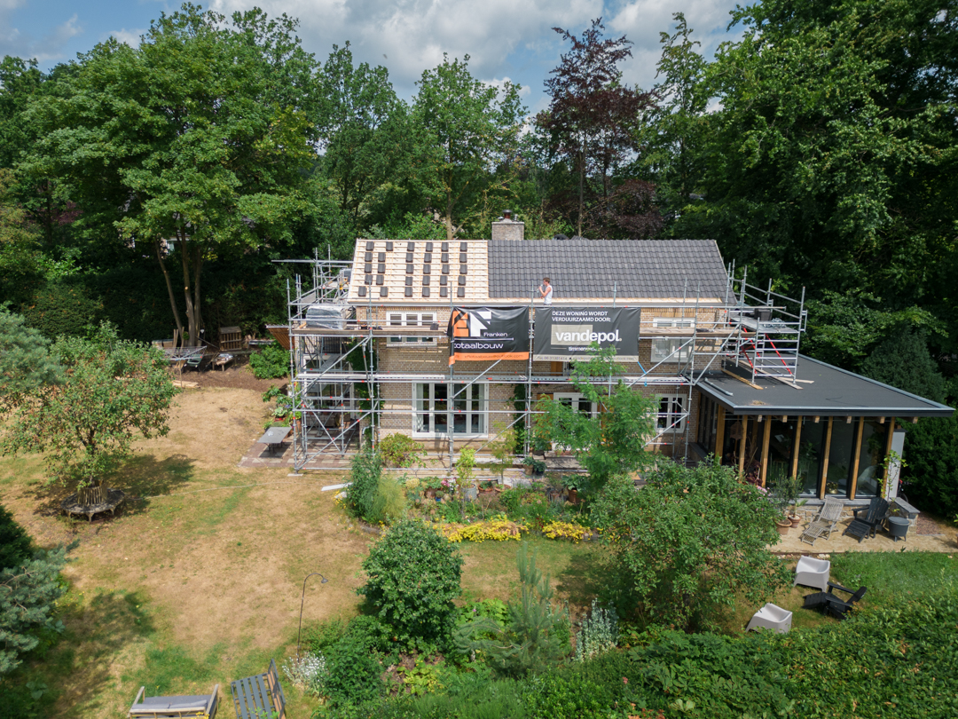 Het complete dak is vernieuwd: isolatie volgens de huidige eisen, nieuwe pannen en goten, en al het lood- en doorvoerwerk rondom schoorstenen hersteld. Met nieuwe zinken goten en regenpijpen is het huis weer lekvrij, warmer en klaar voor jaren.