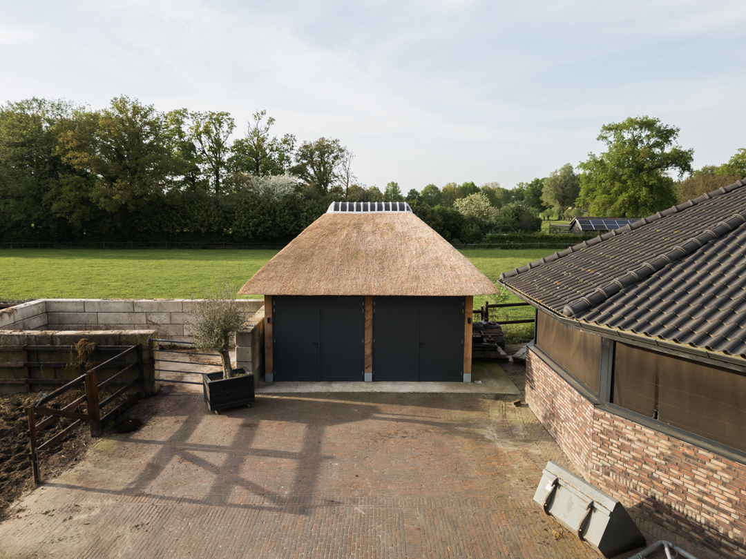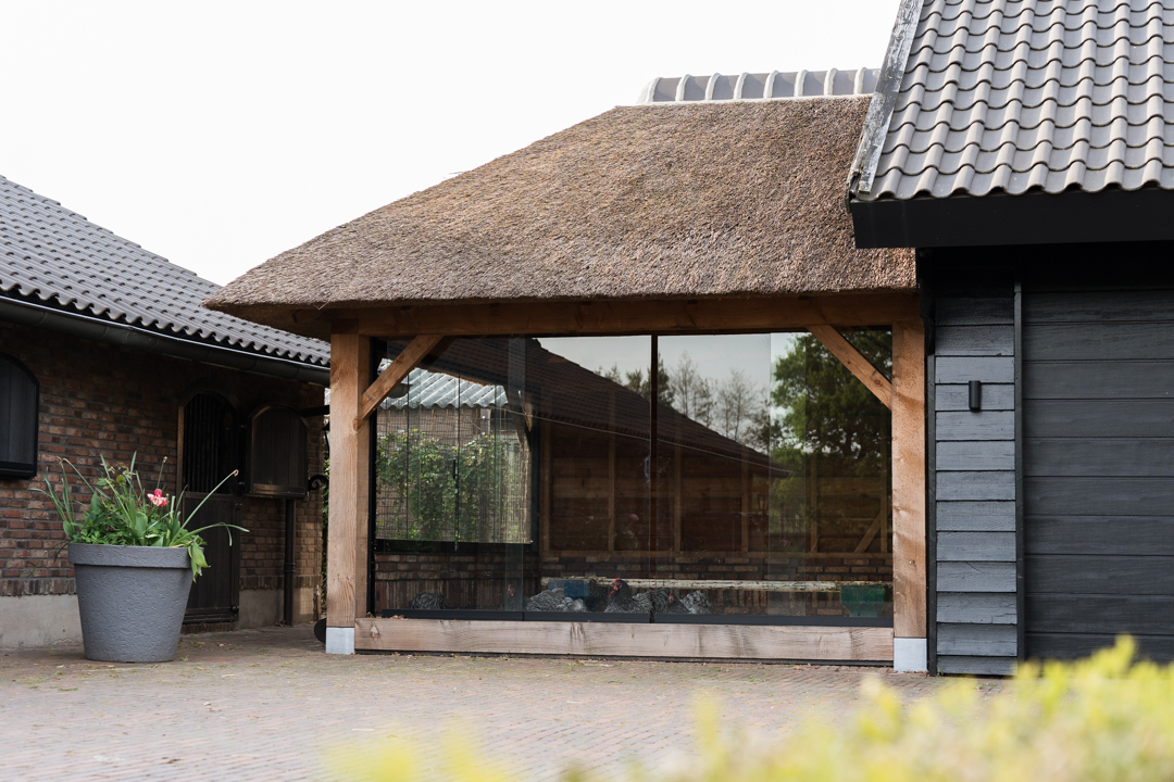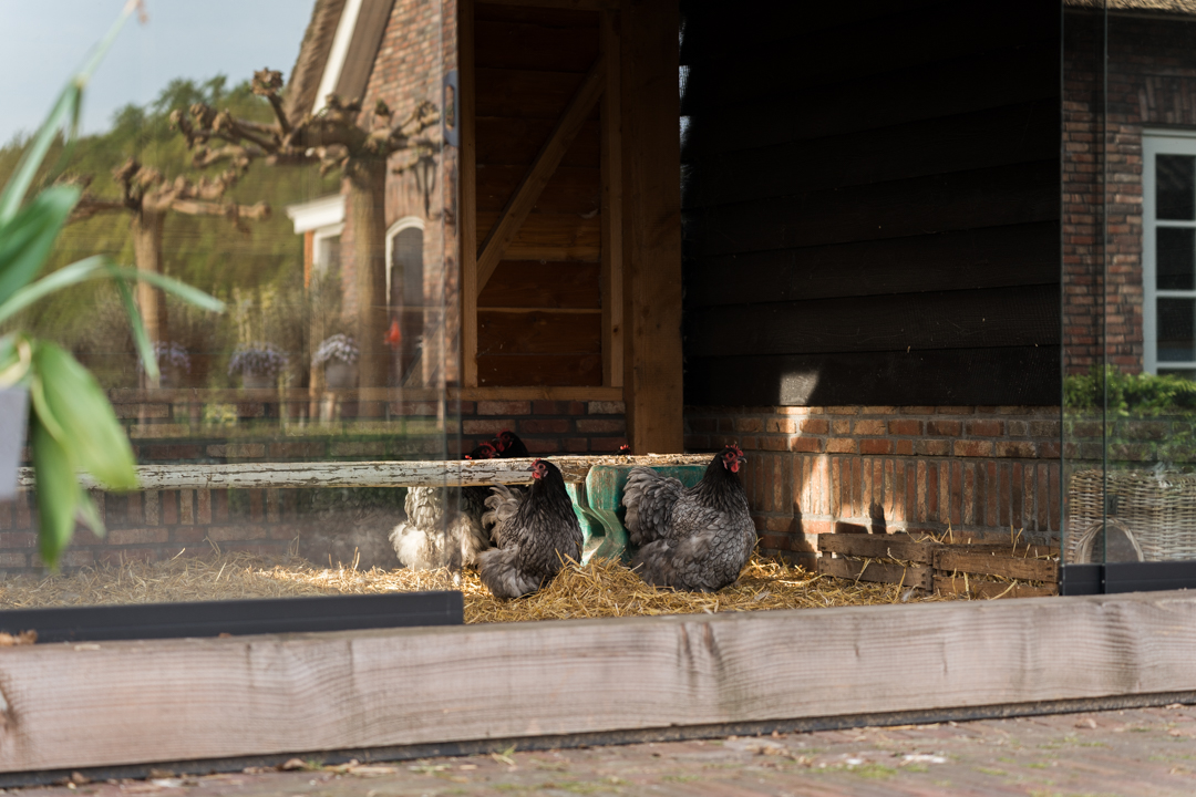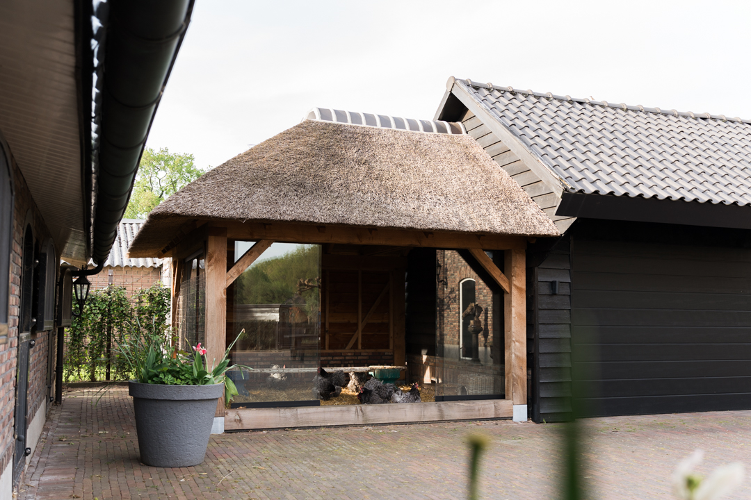 Op één erf bouwden we een praktische prefab schuur voor droge opslag en een kippenhok in dezelfde stijl als de bestaande bebouwing. Materiaal en detaillering sluiten mooi aan op het erf, onderhoud blijft beperkt en het geheel oogt als één geheel.